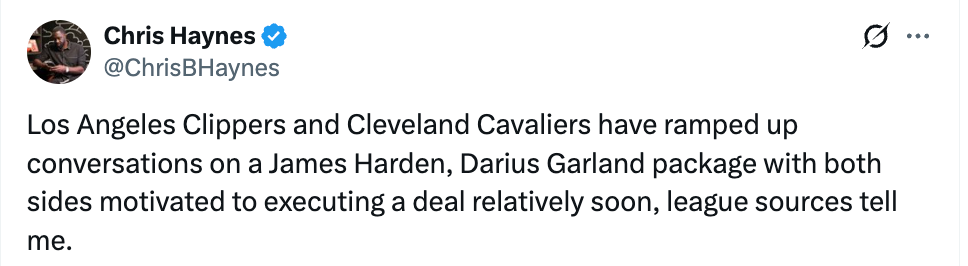 北京时间2月4日,据名记Haynes报道,洛杉矶快船队与克利夫兰骑士队已就涉及哈登和加兰的交易方案加紧谈判,双方都有动力在短期内完成这笔交易。