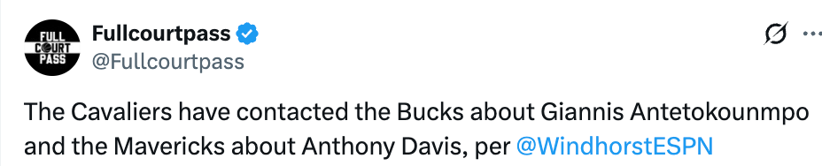北京时间2月4日,据ESPN名记文霍斯特报道,克利夫兰骑士队已联系密尔沃基雄鹿队,询问关于字母哥的交易可能,同时也联系了达拉斯独行侠队,探讨安东尼-戴维斯的交易方案。