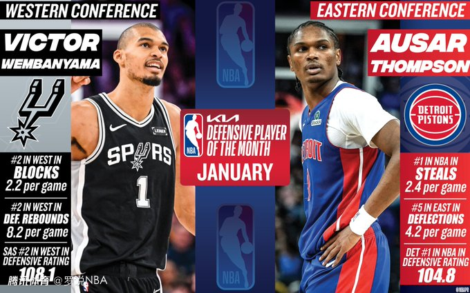 马刺队的文班亚马与活塞队的奥萨尔-汤普森,分别当选一月NBA西部与东部月最佳防守球员。
