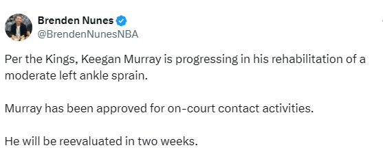 北京时间2月4日,根据国王官方发布的消息显示,基根-穆雷左脚踝中度扭伤的康复进程取得进展。他已获准恢复场上对抗训练,将在两周后接受复查。