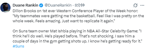 狄龙在谈及斩获生涯首次西部周最佳球员时表示:“是队友们把球传给我,我整周的手感都相当出色。这种感觉太棒了,我希望能再次做到。”在NBA官方公布的第15周最佳球员评选中,狄龙-布鲁克斯当选西部周最佳。上周太阳取得3胜1负的战绩,狄龙在此期间场均贡献28.8分4.5个篮板2.8次助攻,三分命中率54.5%。