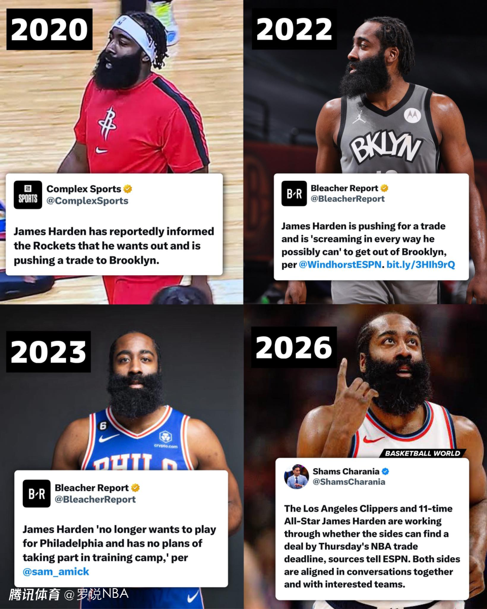 但现实往往事与愿违——哈登每加入一支新球队后没多久,“想走人”的戏码就会上演。