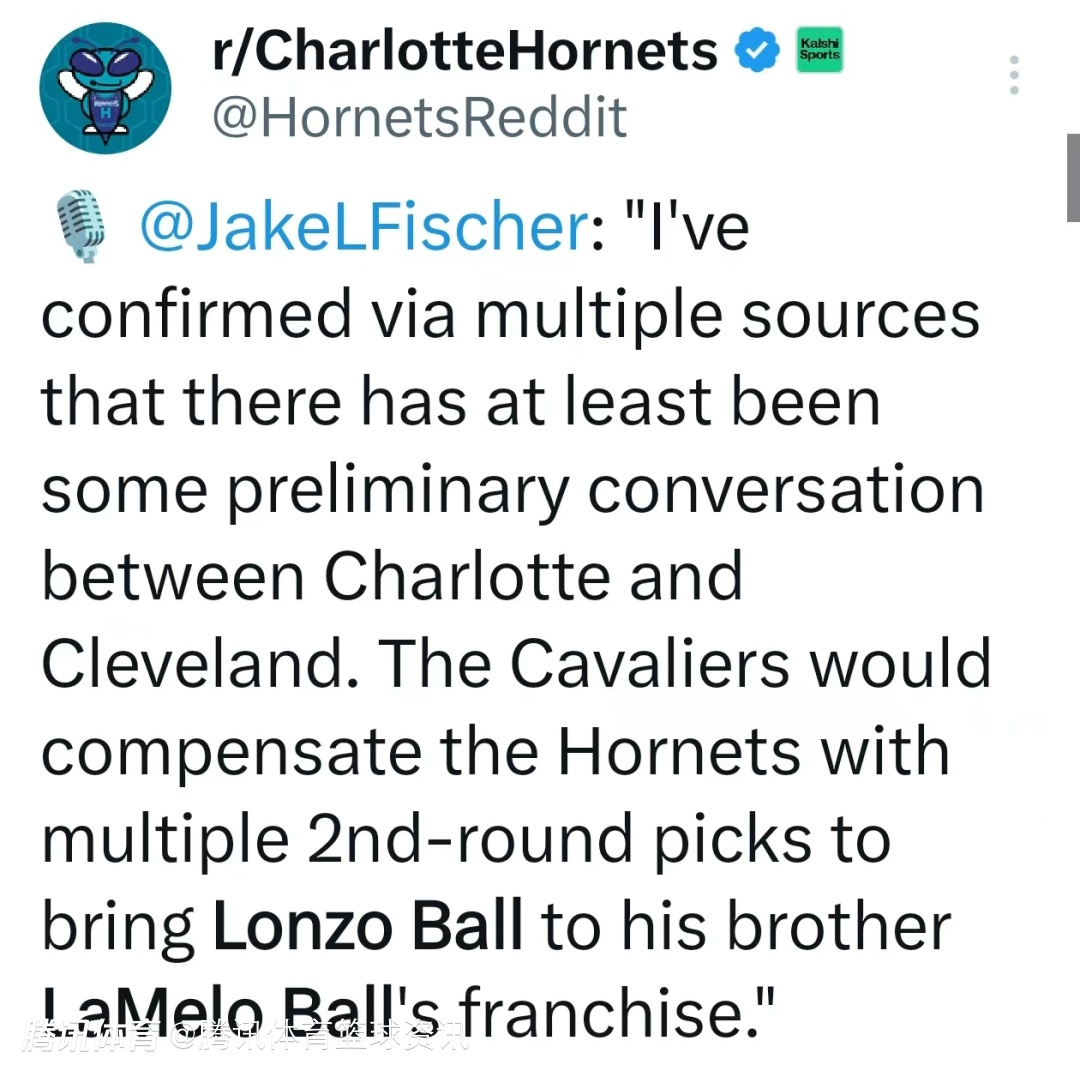 北京时间2月4日,名记Jake Fischer在直播节目中表示,他已通过多个消息源证实,黄蜂与骑士之间至少已进行过初步交易商谈。骑士方面将送出多个次轮签作为筹码,把朗佐-鲍尔(球哥)交易至其弟弟拉梅洛-鲍尔(三球)效力的黄蜂队。