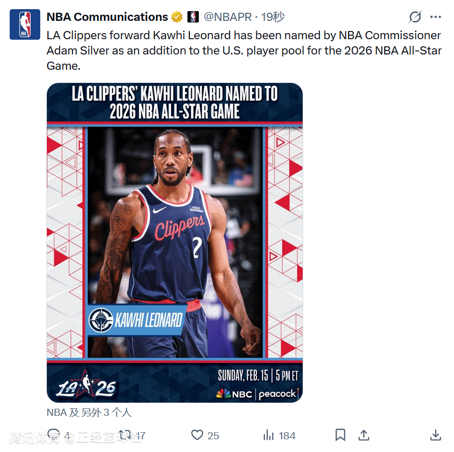 随后名记Shams报道称,莱昂纳德入选2026年NBA全明星赛。在首批24名全明星球员选出后,莱昂纳德的加入使美国全明星球员总数达到16人,满足最低人数要求。