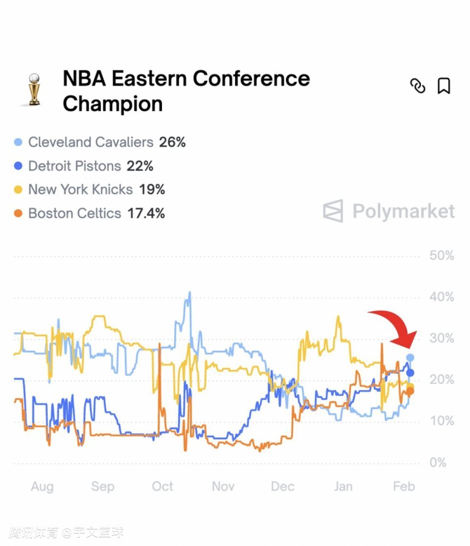 哈登加盟骑士从账面上来看,无疑是一笔划算买卖,他会大大改变整个东部格局。据数据网站PolyMarket显示,随着哈登加盟,骑士在东部夺冠的概率从此前的11%飙升至26%,成为东部目前最炙手可热的队伍,超越东部目前战绩前二的活塞和尼克斯,可见哈登的影响力。