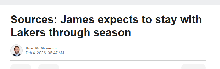 该报道发布两天后,当被问及是否计划留守湖人打完本赛季时,詹姆斯回应道:“我没事……我挺好的。”