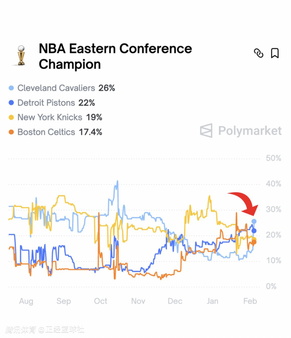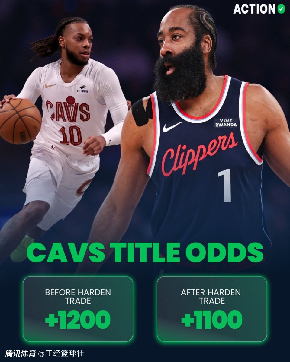 与此同时,多家美媒预测了骑士队的全新五虎:哈登、米切尔、泰森、莫布里、贾勒特-阿伦!在得到哈登之后,骑士队的夺冠赔率也得到了提升,从之前的+1200瞬间提升到+1100。而他们夺得东部冠军的概率已经提升到26%,高居东部第一位!