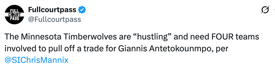 北京时间2月4日,据昨日首爆哈登加兰交易的体育画报记者Chris Mannix报道,明尼苏达森林狼队正全力推进一笔涉及字母哥的交易,并且这笔交易需要四支球队共同参与才能完成。