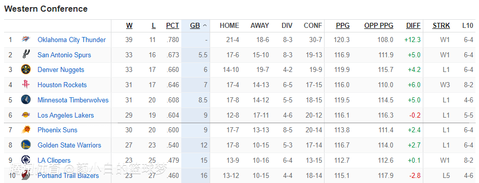 可以看到西部前四的球队只有马刺、火箭1个全明星,但马刺与火箭有着明显的区别,马刺只有文班亚马一个场均20+的球员,而火箭有两个,就连西部第六的湖人都有两个全明星。