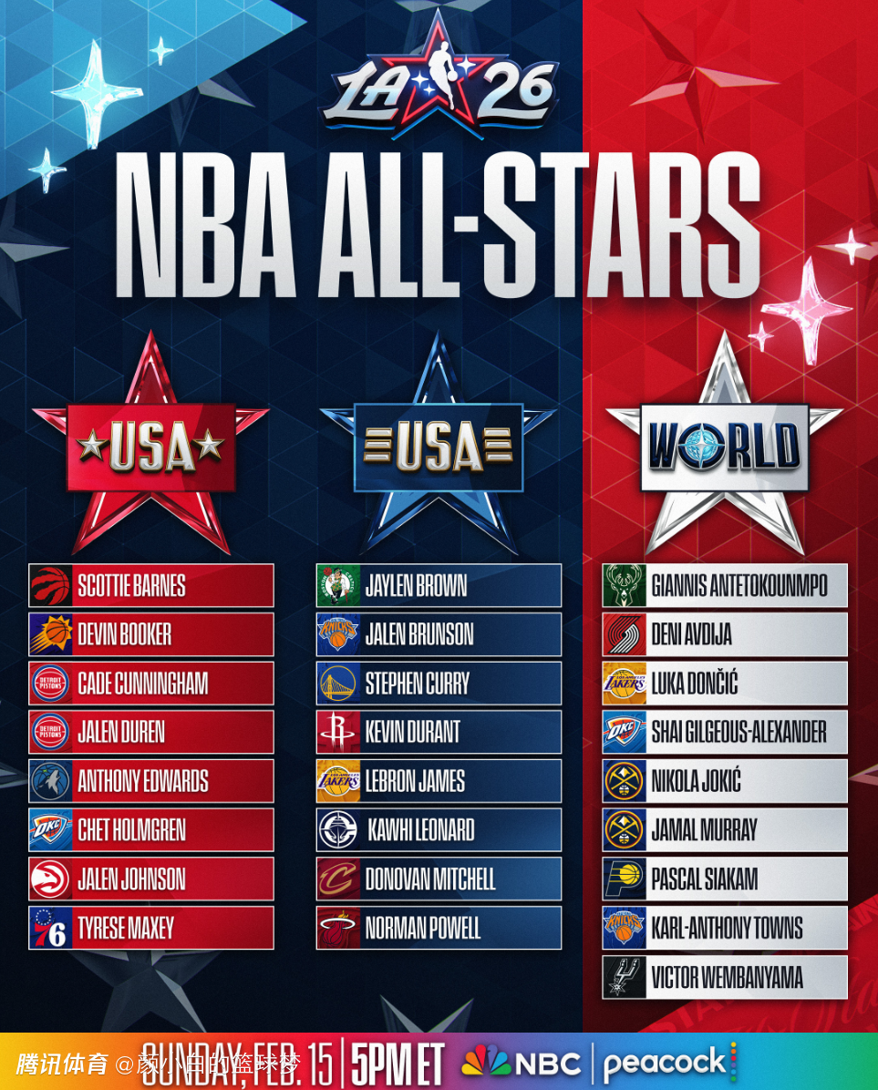因为小卡入选全明星后,三支全明星队伍也就此确定,美国队是以年龄分两队,詹姆斯、杜兰特、库里、布朗、布伦森、伦纳德、米切尔、鲍威尔在一支球队。世界队有9人,