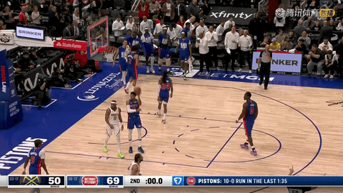 第二节还剩3分钟时,布朗打成2+1后罚球命中,把比分追到50:59。随后从第二节还剩3分钟一直到节末压哨,掘金连续3分钟未能得分,活塞则把比分从59:50拉开到69:50,坎宁安在第二节还剩9秒时命中三分再次扩大优势。