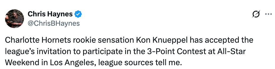 北京时间2月4日,据美记Haynes报道,联盟消息人士透露,夏洛特黄蜂队的新秀克努佩尔已接受联盟邀请,将参加今年全明星周末的三分大赛。