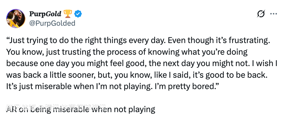 里夫斯谈到无法打球时的煎熬表示:“我只是每天努力做正确的事,尽管过程令人沮丧。你知道的,要相信自己正在做的事情,因为今天你可能感觉很好,明天就不一定了。我希望自己能早点复出,但你懂的,就像我说的,能回来真好。不能打球的日子太难受了,我实在是太无聊了。”