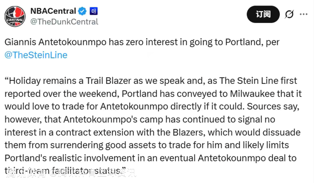 而字母哥本人对加盟开拓者毫无兴趣。消息称,尽管开拓者已向雄鹿表达,若有机会希望直接交易得到字母哥,但字母哥团队已持续明确表态:无意与开拓者续约。这会让开拓者不愿付出优质资产追求他,其在字母哥交易中更可能只作为第三方参与。