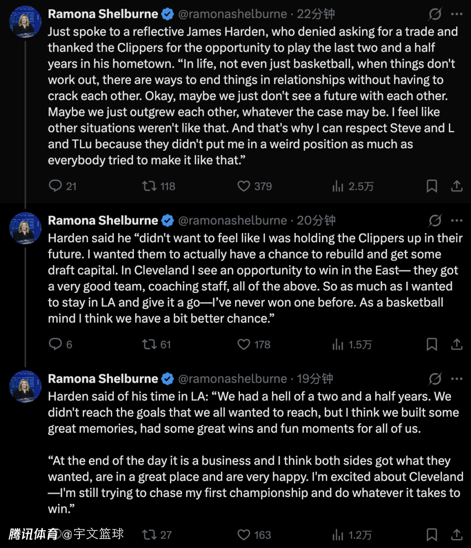据ESPN记者Ramon Shelburne报道,她与哈登进行私下谈话,哈登否认自己要求交易,并感谢快船给他过去两年半在家乡打球的机会。