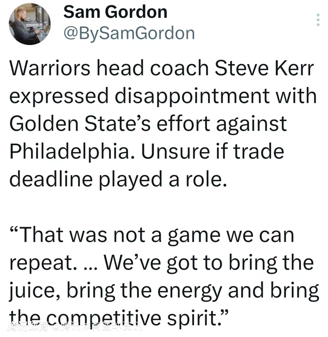 “我不清楚这和交易流言是否有关。教练的工作就是带动能量、打出强度,这才是今晚的重点。对手还是背靠背作战,我们本应该一上来就打出强度、主动出击,但开局前五分钟就失误连连、退防不积极。说到底就是竞争态度——你必须48分钟全力竞争,整个82场常规赛都要树立这种意识,这才是今晚最关键的东西。”
