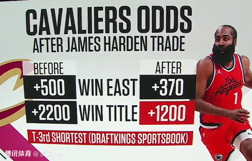数据显示,哈登交易完成前,骑士夺得东部冠军的赔率是+500(数字越小,越被看好),夺得总冠军的赔率是+2200,而哈登交易完成后,骑士夺得东部冠军的赔率变成+370,夺得总冠军的赔率是+1200。显然,哈登的加盟,让骑士更被看好了。