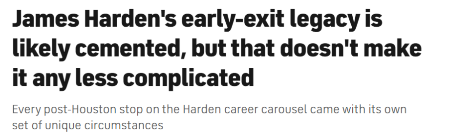 这一次的目的地是克利夫兰——在快船的征程未能如愿后,在与费城不欢而散后,在布鲁克林短暂停留后。频繁改换门庭、季后赛早早出局,这些都将成为哈登职业生涯履历中无法抹去的印记。单从纸面来看,他离开火箭后的这段生涯轨迹,确实难逃外界的诟病。