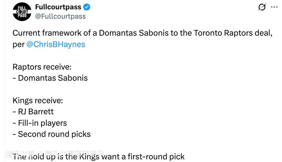目前交易陷入僵局的原因是,国王队想要一个首轮选秀权。