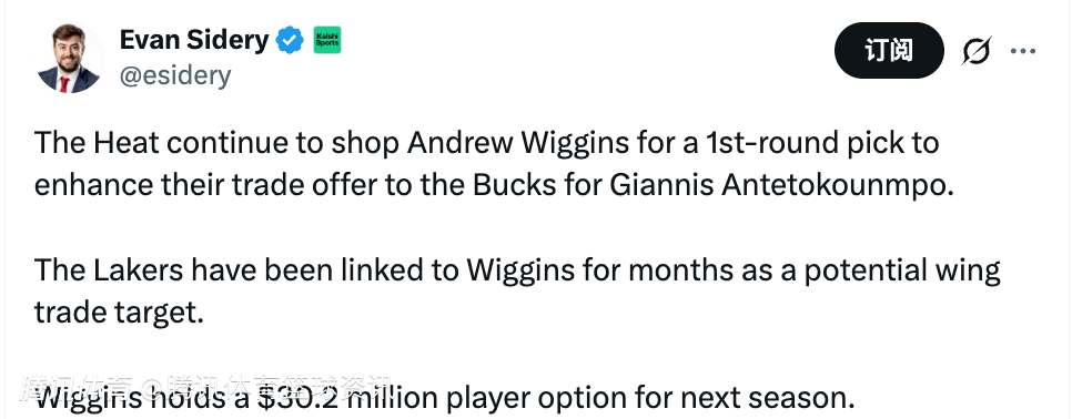 北京时间2月4日,据美记Evan Sidery报道,热火队仍在兜售维金斯,希望用他换来一个首轮签,以此来提升他们向雄鹿队报价字母哥的筹码。
