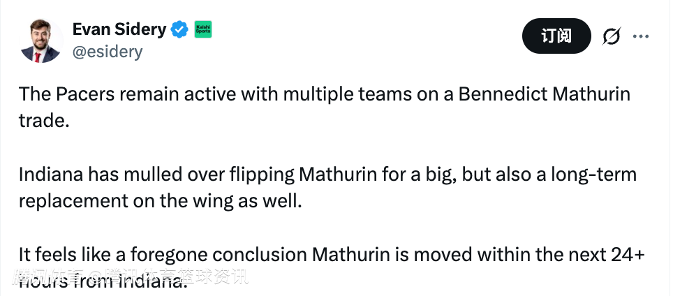 步行者方面既考虑用马瑟林换取一名内线大个球员,也在寻找锋线上的长期替代者。种种迹象表明,马瑟林在未来24小时内离开印第安纳几乎已是板上钉钉的事。
