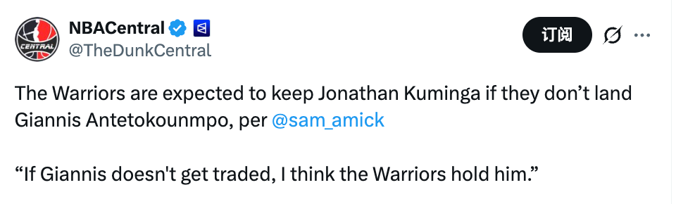 北京时间2月5日,据美记Sam Amick报道,如果无法得到字母哥,勇士预计会留下库明加。