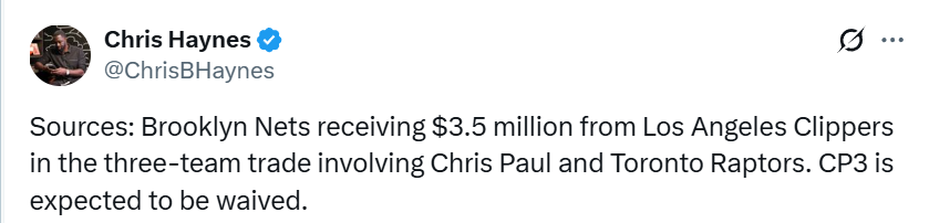 北京时间2月5日,据名记Shams报道,快船、篮网和猛龙达成了一笔关于保罗的三方交易。具体内容如下——