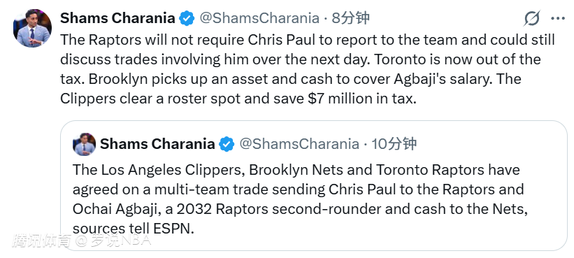 猛龙队不会要求保罗向球队报到,并且可能在未来一天内继续讨论涉及他的交易。随后名记Hayes报道称,猛龙预计会裁掉保罗。