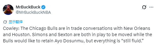 Cowley表示,目前公牛仍与鹈鹕、火箭积极谈判,西蒙斯、塞克斯顿均为赛季后到期合同,仍可能被再次交易;多支球队有意道森姆,但公牛除非收到无法拒绝的报价,否则不会放走他。布泽利斯、吉迪、艾维为球队非卖核心,道森姆紧随其后,球队理想情况下希望今夏与其续约。