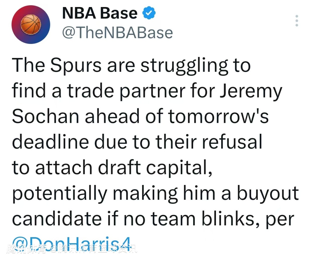北京时间2月5日,据记者Don Harris报道,交易截止日前,马刺不愿搭配选秀权,导致很难为索汉找到交易下家;若没有球队接手,索汉可能成为买断候选人。