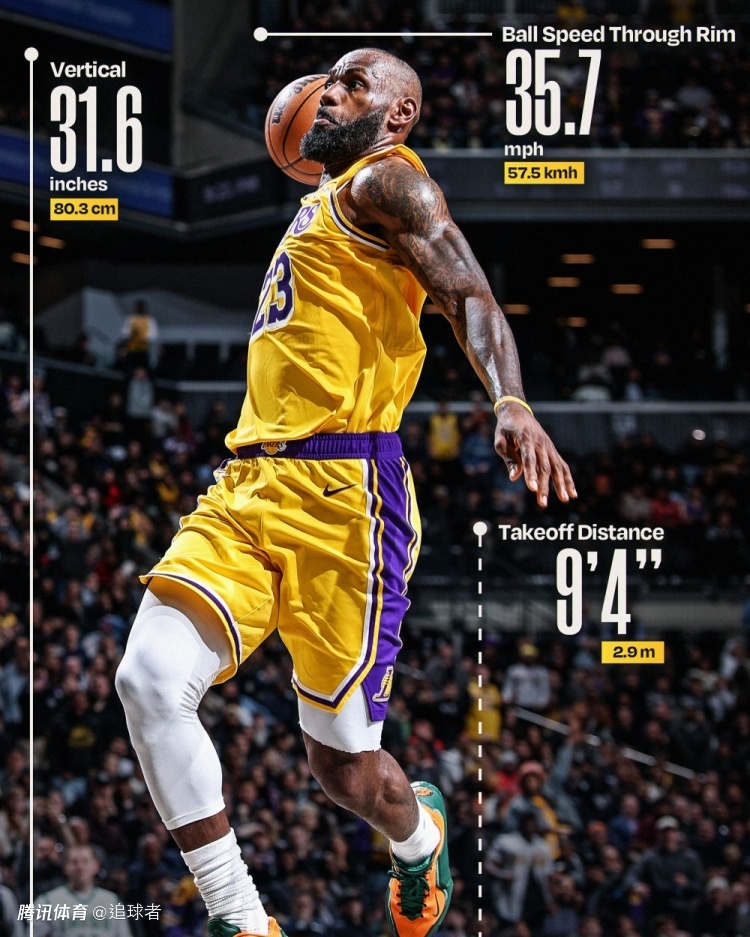 今日詹姆斯连续晒出自己滑翔劈扣的画面,塔图姆、“甜瓜”安东尼、卡鲁索等人纷纷为老詹点赞;据统计,詹姆斯对阵篮网的这一扣垂直起跳80.3厘米,滑行2.9米,球过筐时速57.5公里(16米每秒)。
