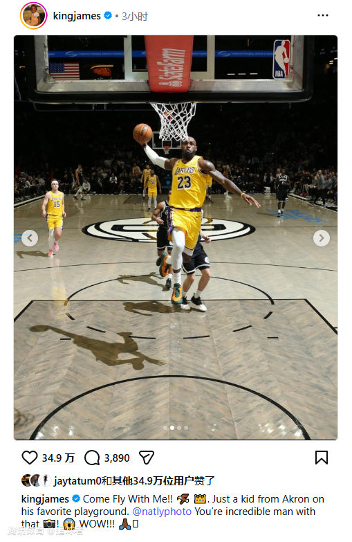 北京时间2月5日,NBA常规赛继续进行,湖人球星勒布朗-詹姆斯更新社媒,晒出昨天对阵篮网时的逆天暴扣画面,配文写道:来和我一起飞翔吧!这只是一个来自阿克伦的孩子在他最喜欢的场地上。@natlyphoto(摄影师),你们的摄影技术太棒了!!!