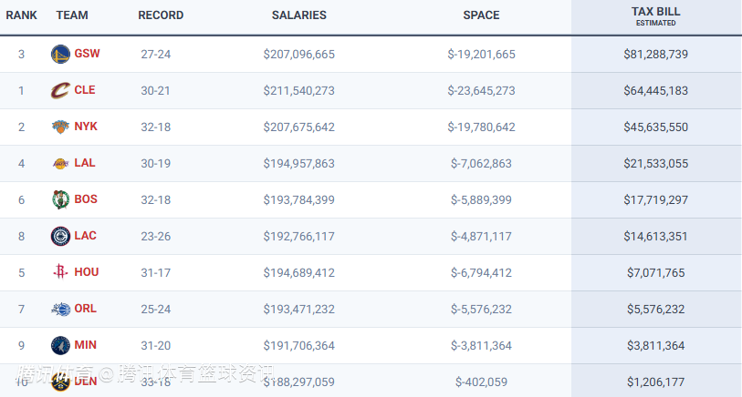 随着骑士奢侈税总额的下调,勇士以8129万美元奢侈税正式升至联盟第一位。