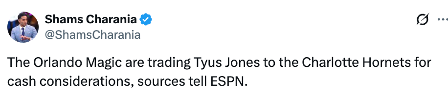 北京时间2月5日,据名记Shams报道,魔术将泰鲁斯-琼斯交易至黄蜂,换取现金补偿。随后薪资专家Bobby Marks跟进报道,这笔交易让奥兰多魔术队的薪资总额降到了奢侈税线以下。