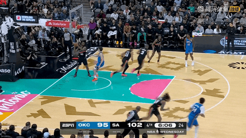 随后肯里奇-威廉姆斯补篮、杰林-威廉姆斯罚球以及华莱士空切上篮接连为雷霆追分,比分在第四节还剩2分05秒来到104:110。然而文班亚马在还剩2分30秒和1分46秒两次空接、补篮得手,卡斯尔在还剩1分15秒突破上篮命中,马刺再次将优势扩大到两位数。