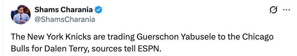 北京时间2月5日,据名记Shams报道,尼克斯将亚布塞莱交易至公牛,换回达伦-特里。