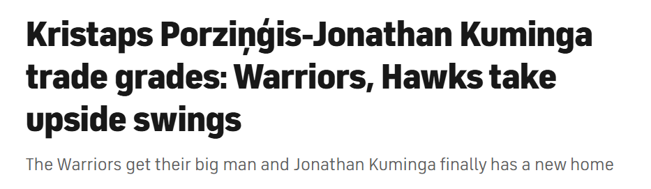 这笔波尔津吉斯的交易虽然远不如引进字母哥那般振奋人心,但它向库里和球队球迷表明,球队仍在努力补强阵容