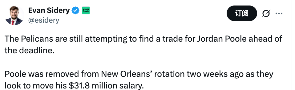 北京时间2月5日,据美记Evan Sidery报道,鹈鹕队仍在尝试交易截止日前送走乔丹-普尔。