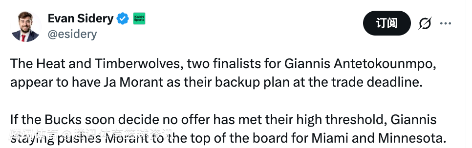 北京时间2月5日,据美记Evan Sidery报道,热火队与森林狼队是字母哥的两大潜在下家,而据消息,他们在本次交易截止日前都将莫兰特列为了备选方案。