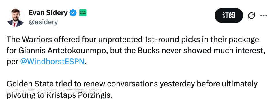 北京时间2月6日,据ESPN名记文霍斯特报道,勇士队在追求字母哥的报价中,愿意送出四个不受保护的首轮签,但雄鹿队对此从未表现出太多兴趣。勇士队昨天还尝试重启谈判,但最终将目标转向了波神。