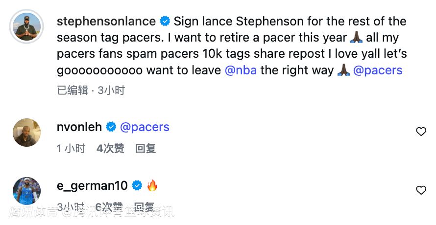史蒂芬森社媒原文如下:签下史蒂芬森打完本赛季剩余的比赛吧,@步行者队。我想今年以步行者球员的身份退役,所有步行者的球迷们,快去刷1万条@步行者队的标签,转发起来!我爱你们所有人,冲啊!我想以正确的方式告别步行者队。”而在评论区,包括前CBA上海队外援冯莱和现北京队小外杰曼都对其力挺。