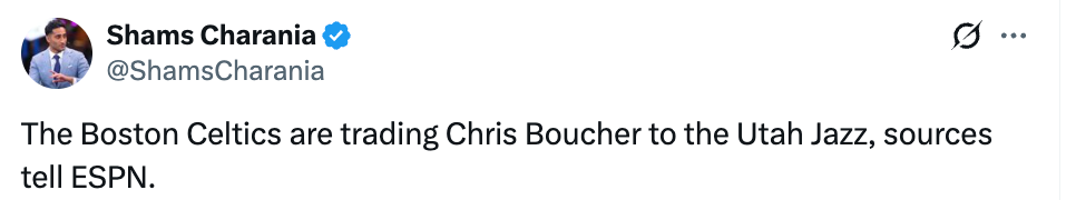 北京时间2月6日,据名记Shams报道,凯尔特人将布歇交易至爵士。随后美记Keith Smith跟进报道,绿军交易布歇是为了避税,并且腾出一个阵容名额。