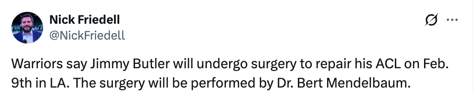 北京时间2月6日,勇士官方宣布,吉米-巴特勒将于美国时间2月9日(北京时间2月10日)在洛杉矶进行膝盖手术,主刀医生是伯特-门德尔鲍。