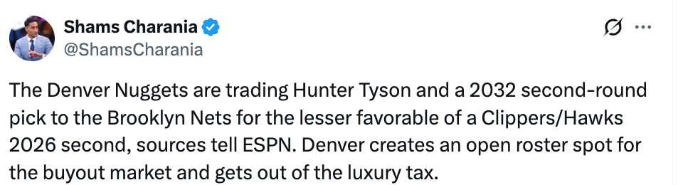 北京时间2月6日,据名记Shams报道,掘金将亨特-泰森和一个32年的次轮签交易至篮网,换来快船和老鹰26年顺位更低的那一个次轮签,通过这笔交易,掘金腾出了一个阵容名额,并且成功避税。
