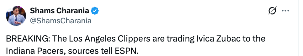 北京时间2月6日,据名记Shams报道,快船将祖巴茨交易至步行者。