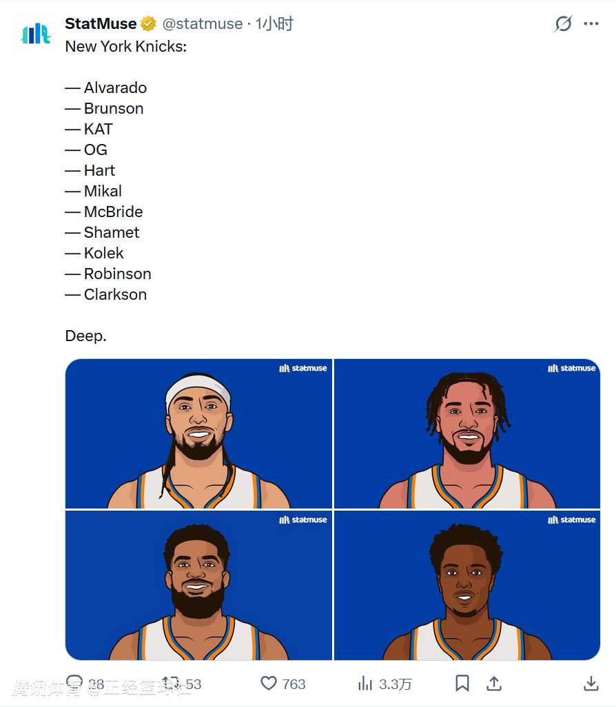 著名StatMuse列出了尼克斯队目前最新的阵容名单,并评价其“深度十足”。完整名单如下: