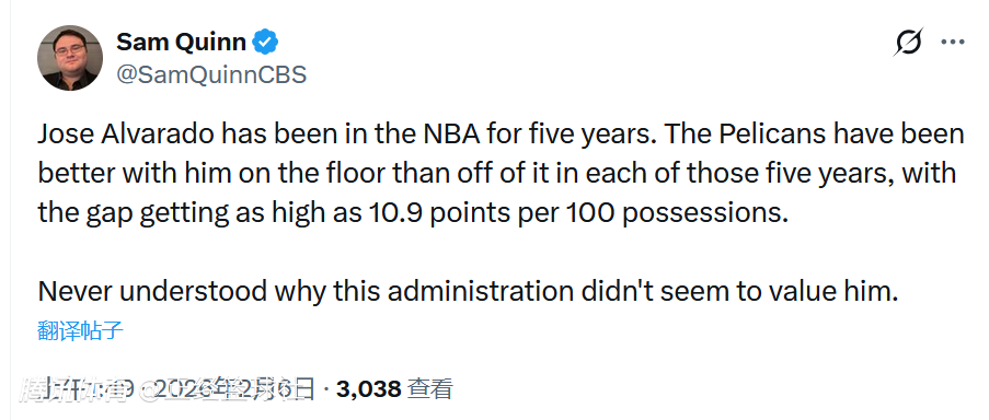 对于这笔交易,美媒CBS的记者Sam Quinn在个人社媒上评论道:“阿尔瓦拉多已在NBA征战五个赛季,这五个赛季里,鹈鹕队在他登场时的表现均优于他离场时,百回合净胜分差距最高达10.9分。所以我一直搞不懂,为何球队管理层似乎从未重视过他。”