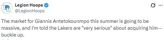 字母哥暂时留在雄鹿,但今夏联盟多支球队将再次打响字母哥争夺战;据美媒Legion Hoops报道,今年夏天,字母哥的转会市场将会非常火爆,而且消息人士透露,湖人队将会非常认真地追求他。