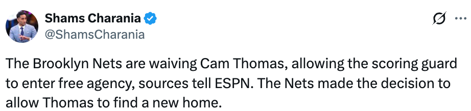 北京时间2月6日,据名记Shams报道,布鲁克林篮网队将裁掉卡姆-托马斯,使其成为自由球员。篮网队做出这一决定,是为了让托马斯能够寻找新的下家。