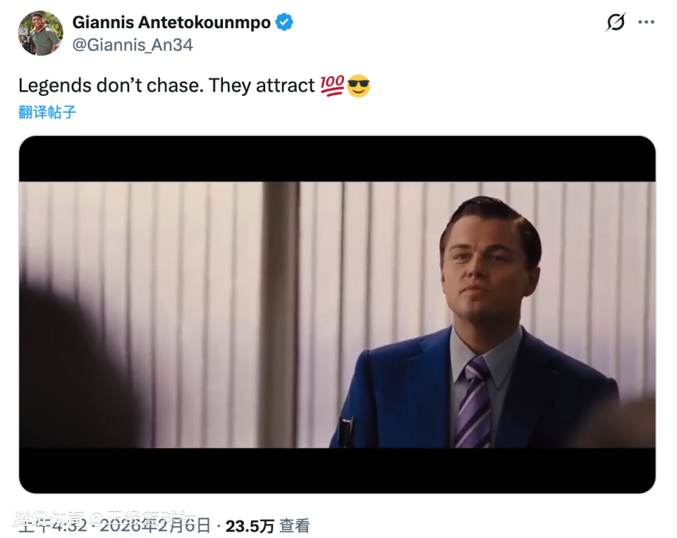 字母哥也随后更新了社媒,他引用了电影《华尔街之狼》中,莱昂纳多-迪卡普里奥饰演的乔丹-贝尔福特在发表演讲的经典片段,当时乔丹-贝尔福特在电影中喊道: "I'm not f**king leaving!"。字母哥配文写道:“真正的强者从不刻意讨好,他们自带吸引力。”